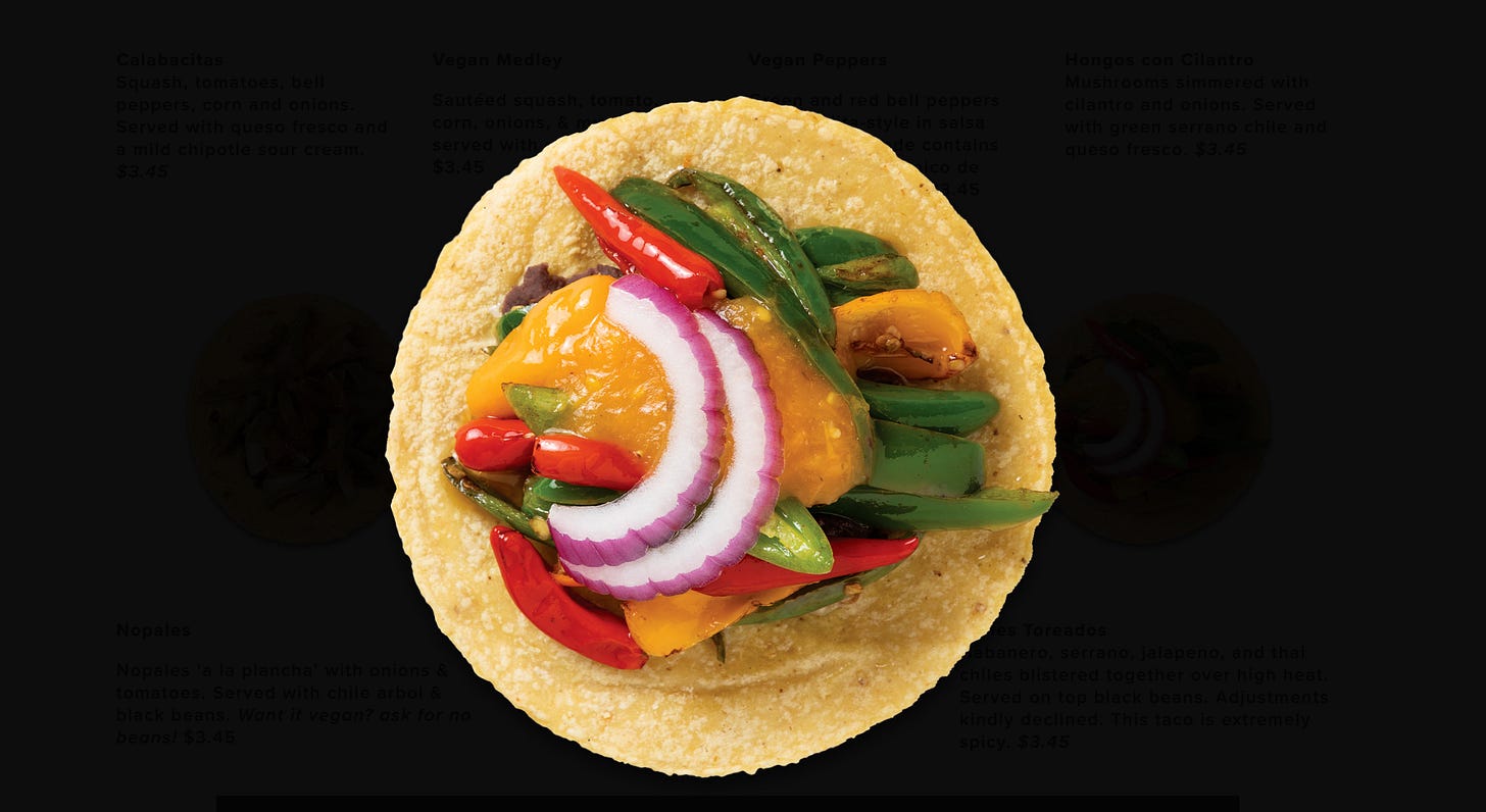 Habanero, serrano, jalapeno, and thai chiles blistered together over high heat. Served on top black beans. Adjustments kindly declined. This taco is extremely spicy. $3.45